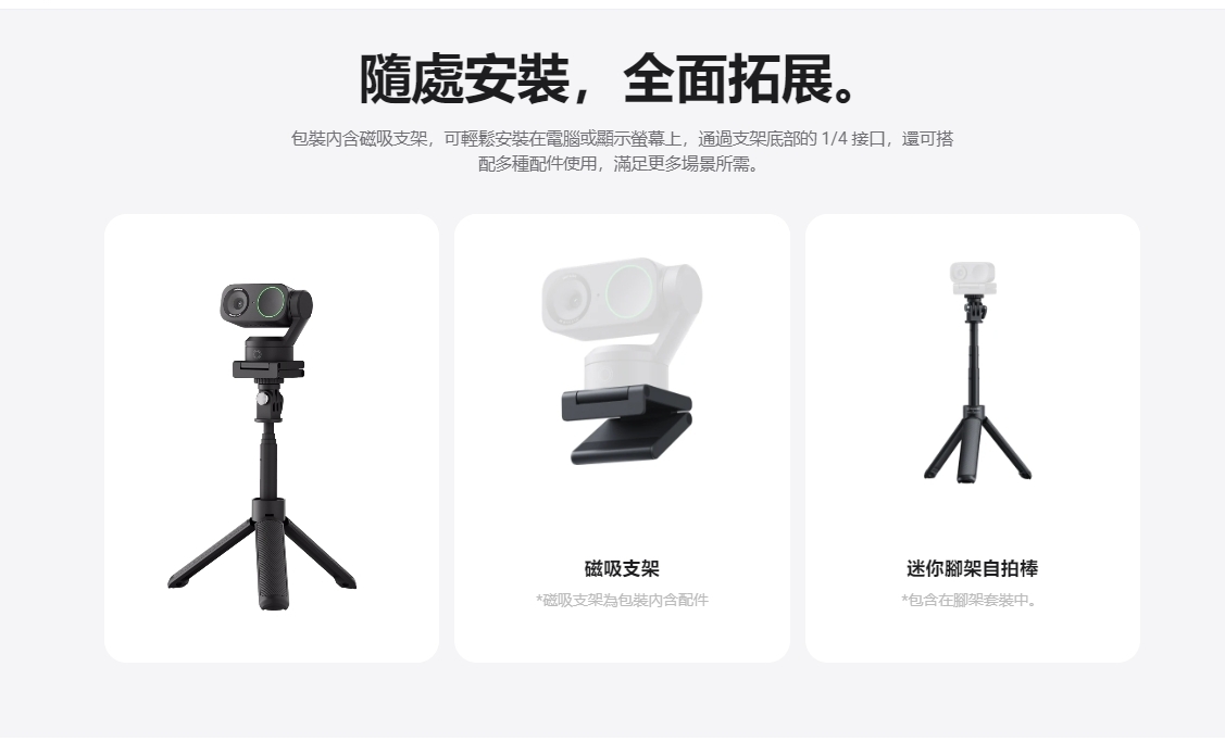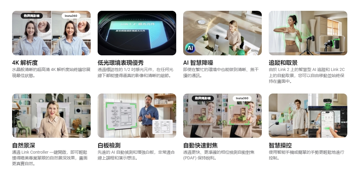 4K 解析度, AI 智慧降噪, 低光環境表現優秀, 追蹤和取景, 自然景深, 白板檢測, 自動快速對焦, 智慧操控