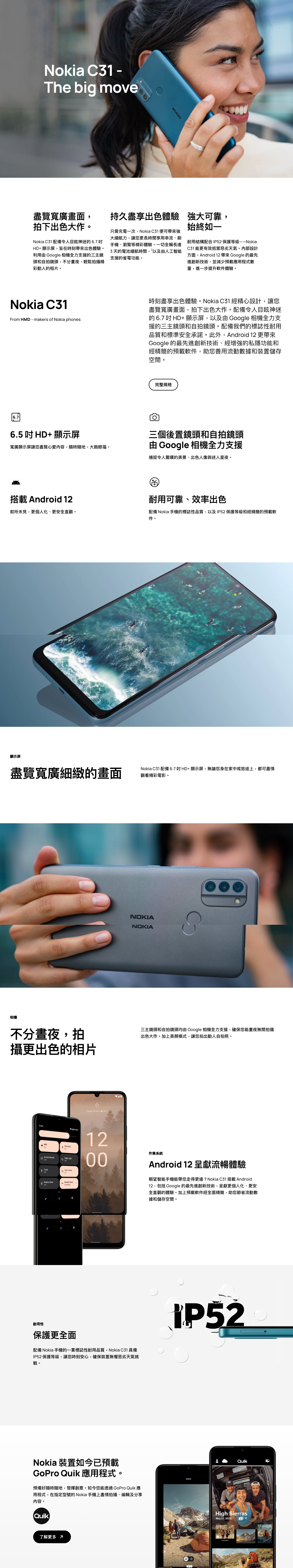 Nokia C31 經精心設計,讓您盡覽寬廣畫面,拍下出色大作。配備令人目眩神迷的 6.7 吋 HD+ 顯示屏,以及由 Google 相機全力支援的三主鏡頭和自拍鏡頭。配備我們的標誌性耐用品質和標準安全承諾。此外,Android 12 更帶來 Google 的最先進創新技術、經增強的私隱功能和經精簡的預載軟件,助您善用流動數據和裝置儲存空間。