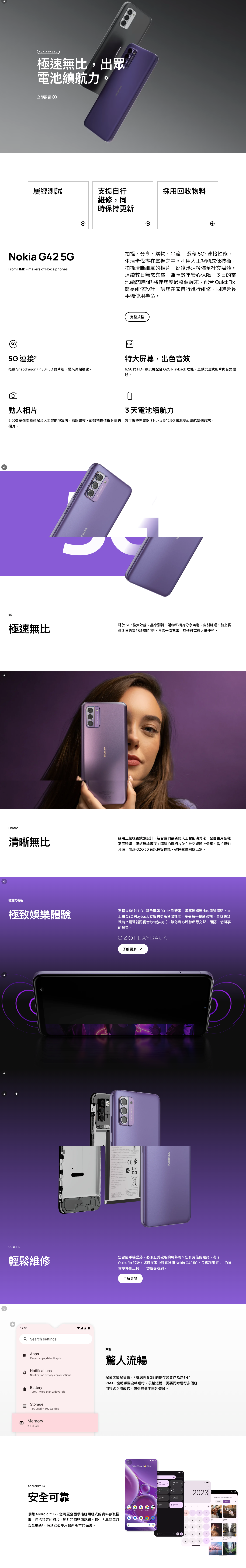 拍攝、分享、購物、串流 — 憑藉 5G² 連接性能,生活步伐盡在掌握之中。利用人工智能成像技術,拍攝清晰細膩的相片,然後迅速發佈至社交媒體。連續數日無需充電,兼享數年安心保障 — 3 日的電池續航時間³ 將伴您度過整個週末,配合 QuickFix 簡易維修設計,讓您在家自行進行維修,同時延長手機使用壽命。