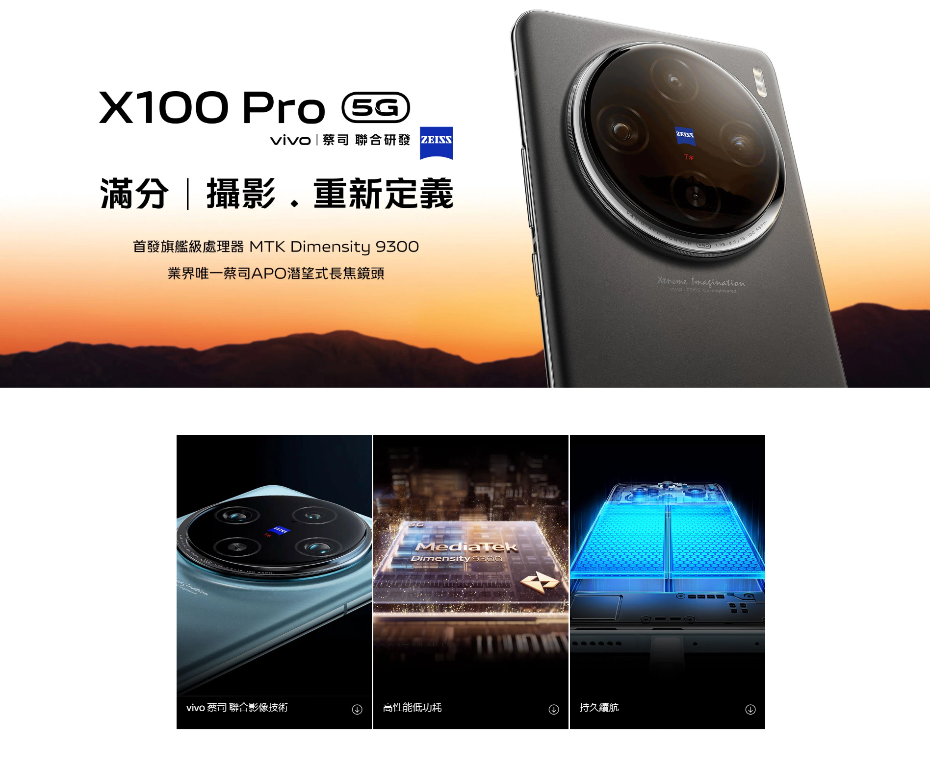 首發旗艦級處理器MTK9300 ︳自研V3影像晶片(6nm台積電製) ︳Hi-Fi 音效晶片 ︳業界唯一蔡司APO 潛望式長焦鏡頭 ︳蔡司4K電影級人像拍攝及後製 ︳蔡司長焦微距拍攝
